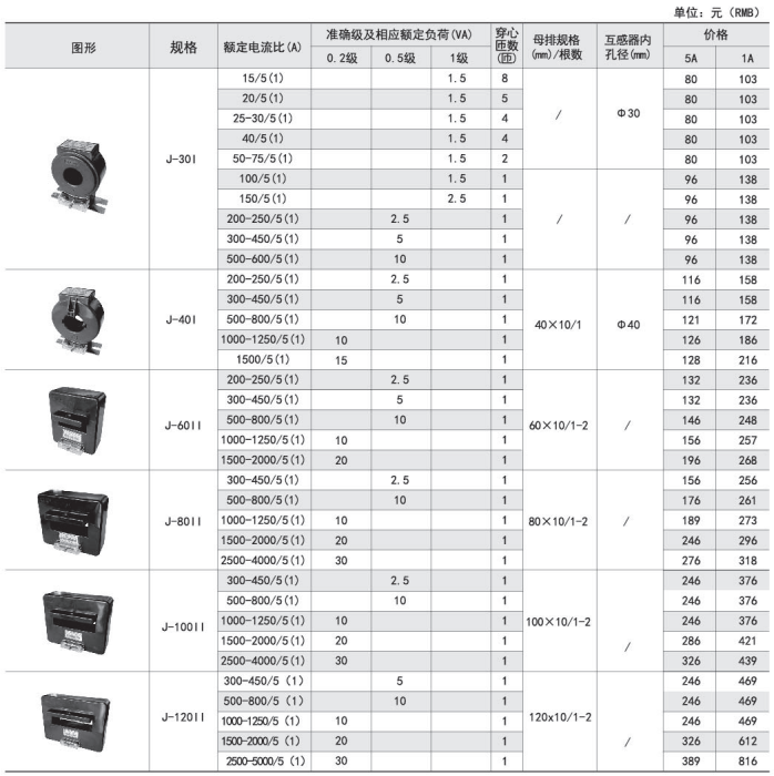 | 规格 | 额定电流比(A) | 准确级 | 穿心匝数 | 母排规格/根数 | |