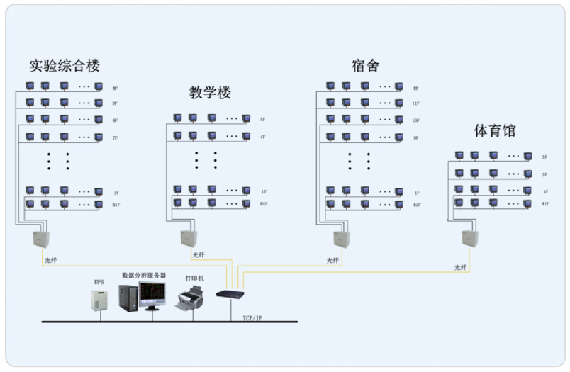 安科瑞Acrel-5000建筑能耗分析管理系统根据上海复旦中学西部校区现场实际情况,整体网络结构采用屏蔽双绞线直接接至楼层弱电井的数据采集器然后通过光纤将数据上传至的监控主机。该系统主要采用分层分布式计算机网络结构,站控管理层、网络通讯层和现场设备层。