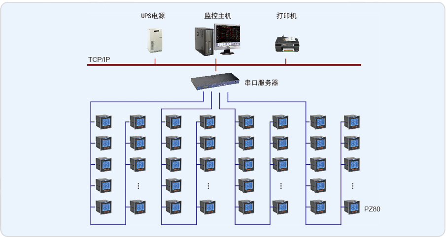 本项目共有一个配电室,位于地下二层,本栋大楼所有供电均从该配电室配出。另外,本工程还配备一台360KW柴油发电机组,作为备用电源,当市电停电时,从变电所市电开关辅助接点取发电机自启动信号至发电机组,发电机组自启动。在低压配电,共有2两路低压配电进线,两面电容补偿柜,一面双电源切换柜,53路出线回路以及联络柜。所有回路安装安科瑞电气股份有效公司的PZ系列可编程电测表,对本回路用电情况进行实时采集、处理。