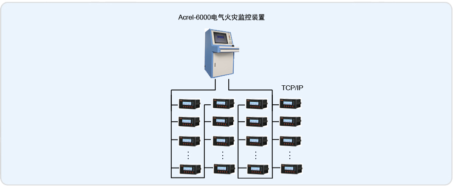 本项目上现场配电箱内安装ARCM200L-J1漏电火灾探测器配合AKH-0.66L剩余电流互感器,消防控制室内安装有Acrel-6000电气火灾监控主机。安科瑞漏电火灾探测器均采用Modbus-RTU通讯协议,RS-485接口,通过两条屏蔽双绞线连接至监控主机。